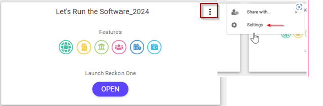 - Click on the three vertical dots on the top right corner of the tile for the relevant Reckon One book.