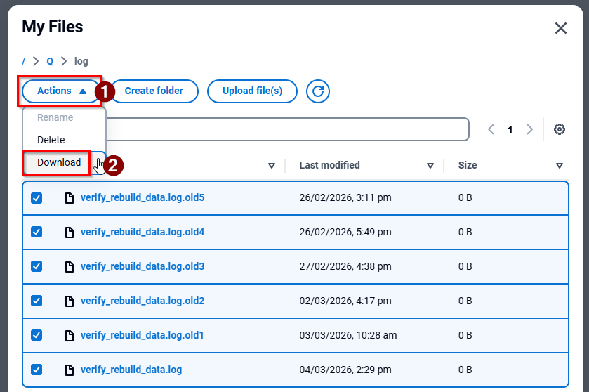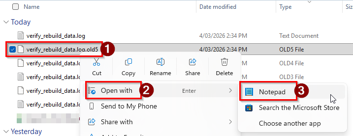 To view the verify_rebuild_data.log file you will need to download it from the Hosted platform onto your local computer.
