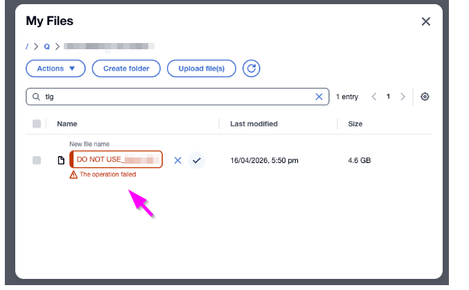 .TLGfile that matches your company file name. - Tick the checkbox next to the correct file, then click Actions > Rename.