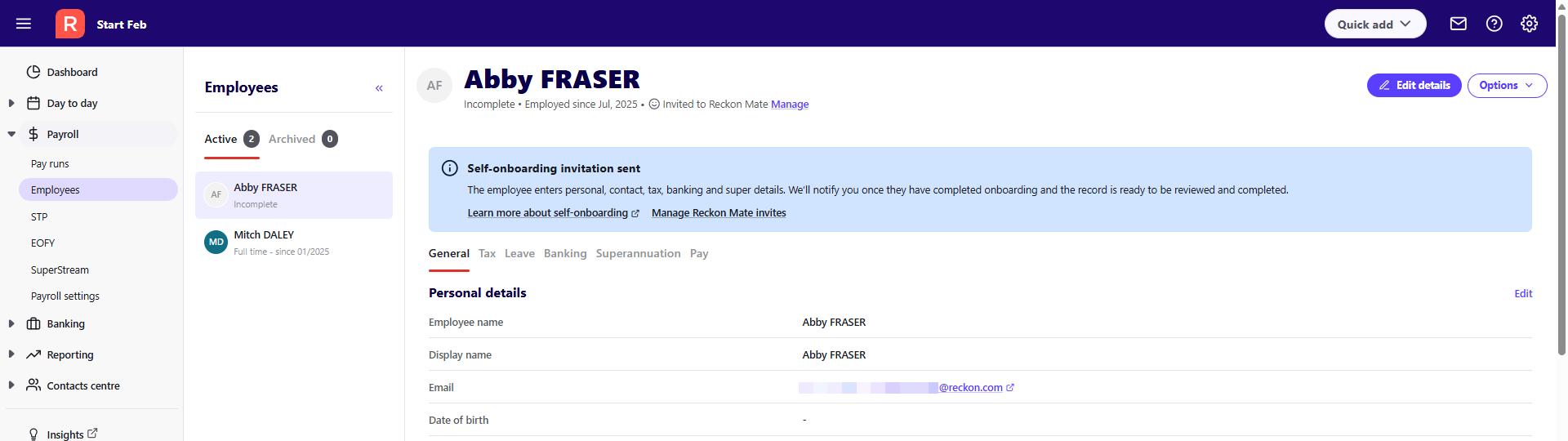 - An incomplete employee profile will be created in Reckon One, and the employee will receive an email invitation to set up their account and enter their details in the Reckon Mate app. A banner will also be displayed in the employee profile, confirming that the self-onboarding invitation has been sent.