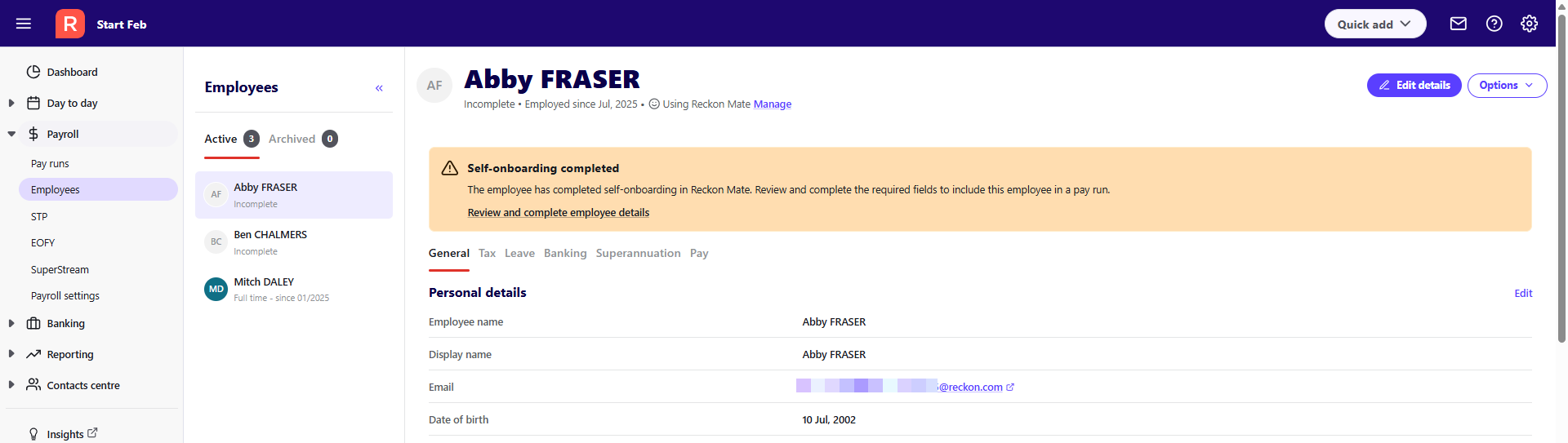 You'll receive an email notifying you when the employee has submitted their self-onboarding. To complete the employee onboarding process in Reckon One: