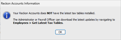 - A warning will also appear during pay runs if Reckon Accounts detects that a newer tax table version is available.