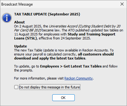 - If you process a pay run after 24 September, and the payment date is within the 2025/26 financial year, Reckon will use the updated tax tables, including the new STSL formulas.