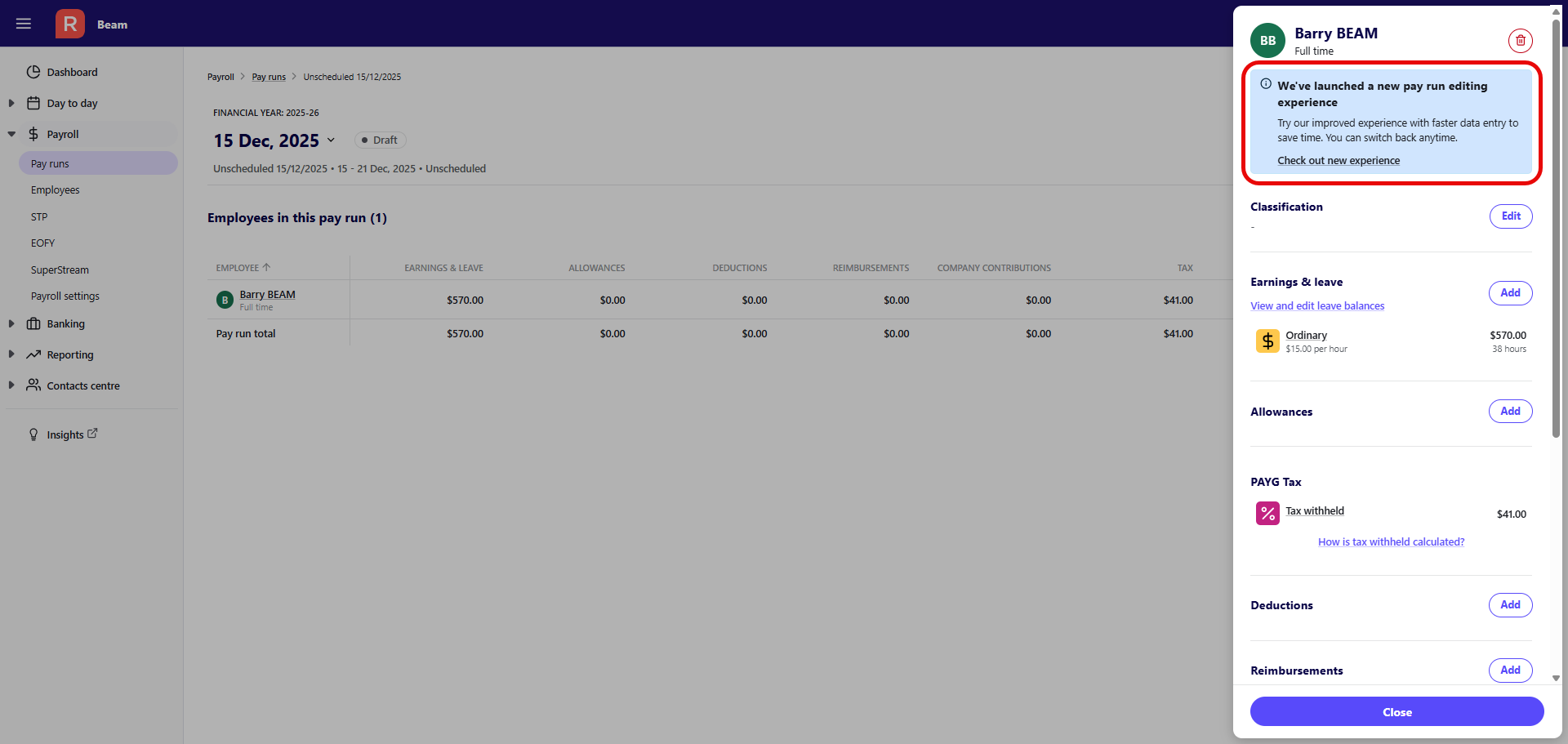 - Switch to the new pay run editing experience in Reckon One
