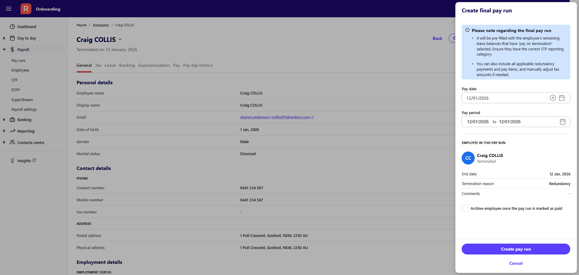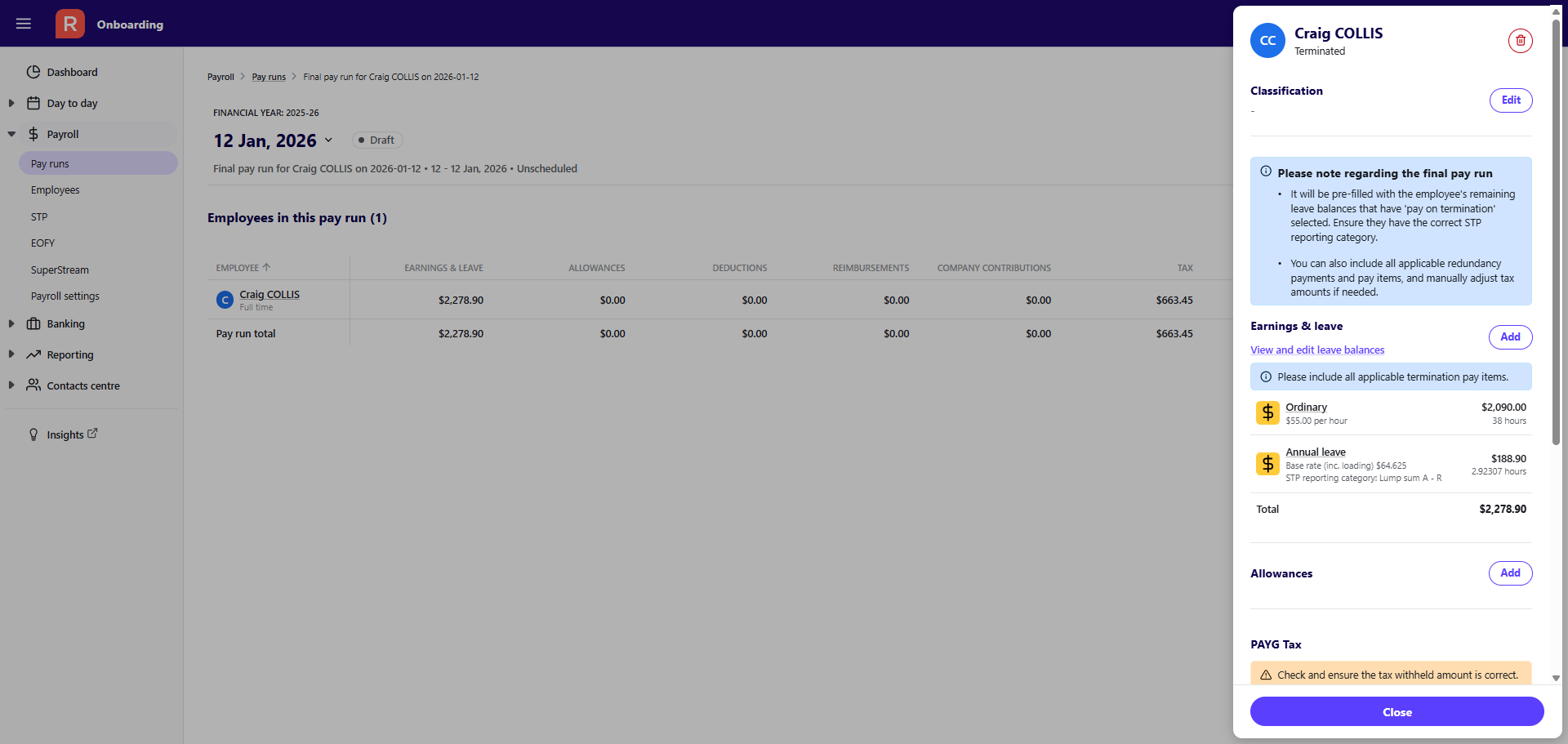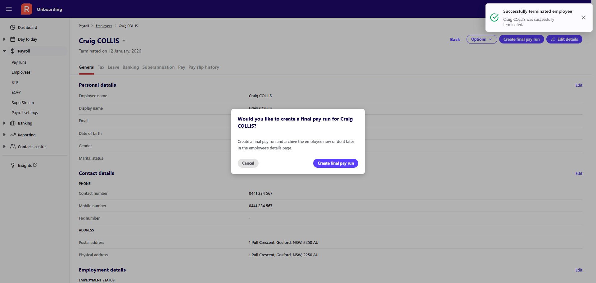 Terminate an employee and creating a final pay run