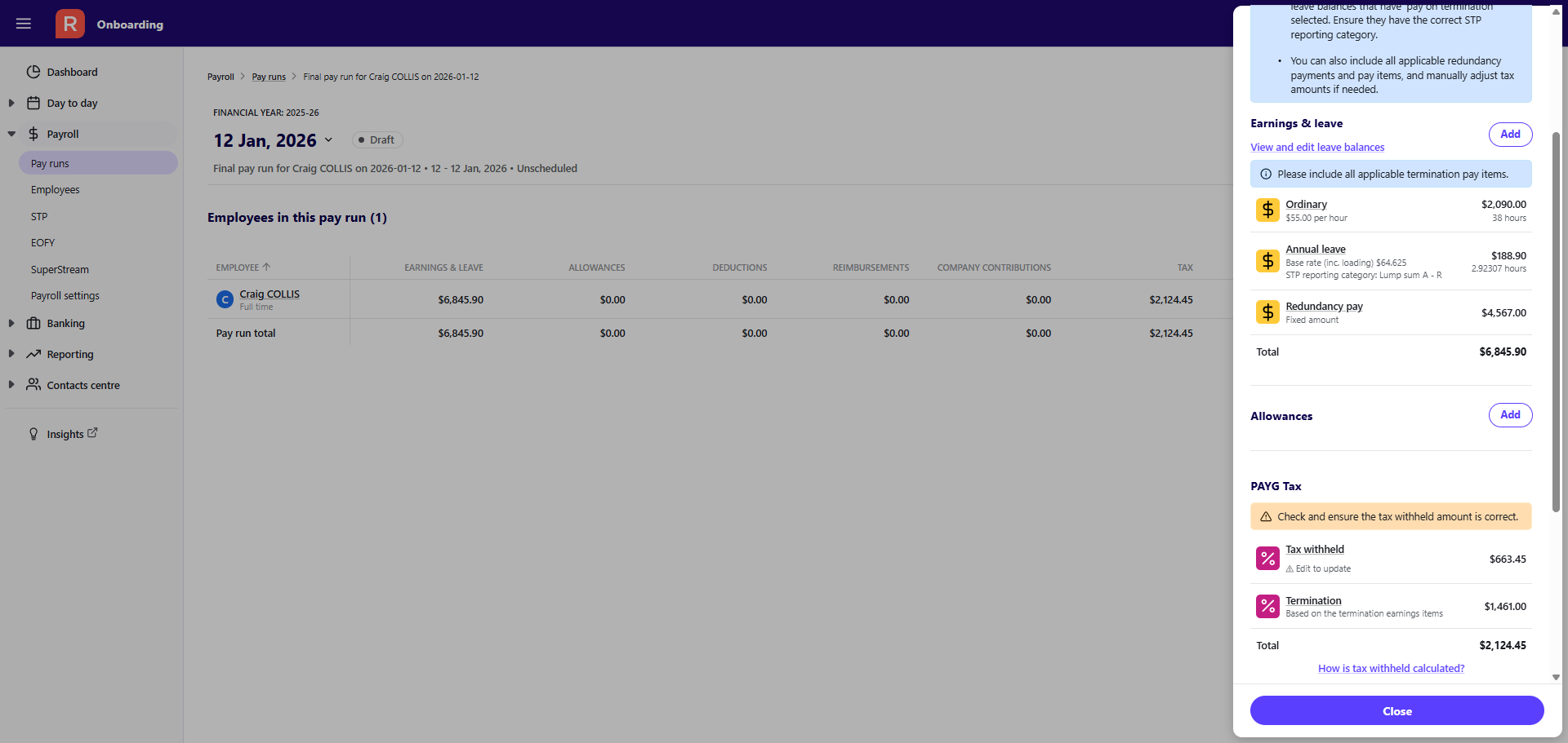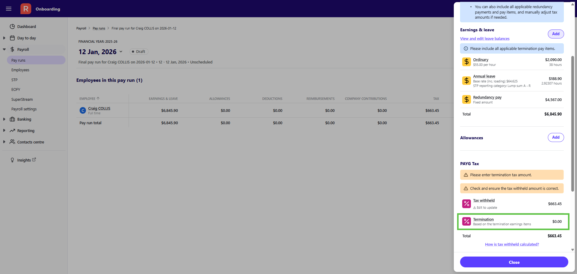 Process a termination (final) pay run in Reckon One