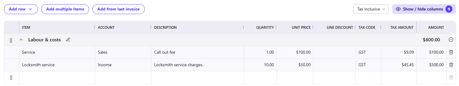 You will be able to see item details and change the group name when editing the invoice, but your customer will not see individual items, only the group.
