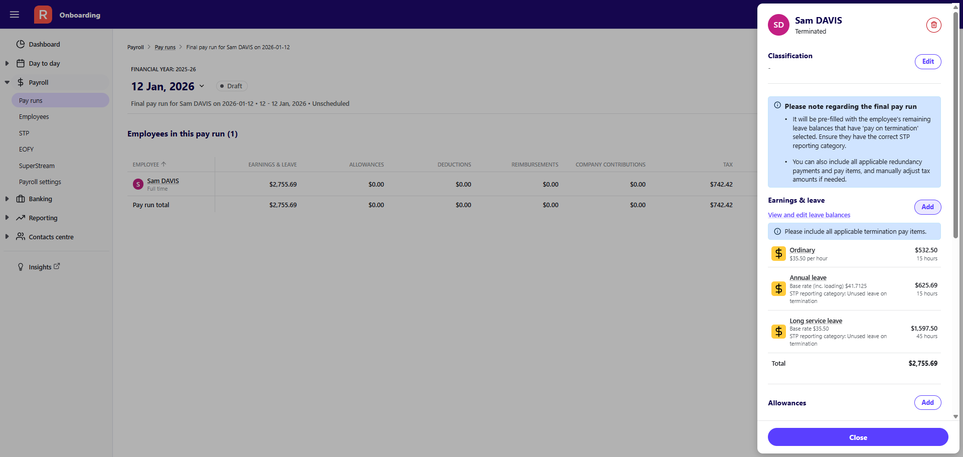 Process a termination (final) pay run in Reckon One