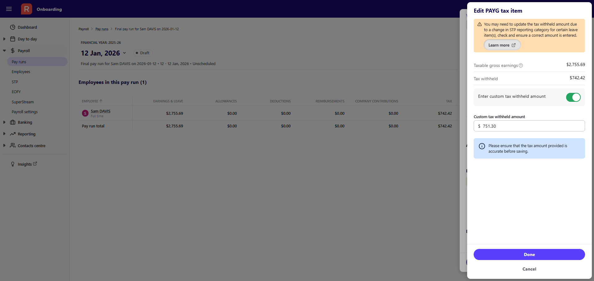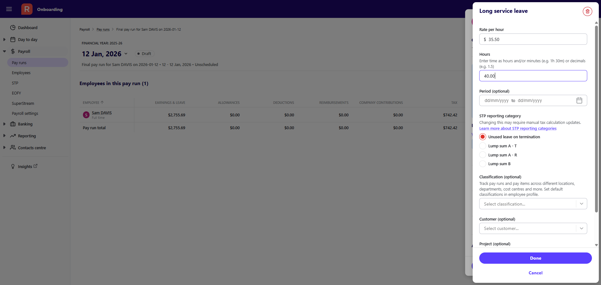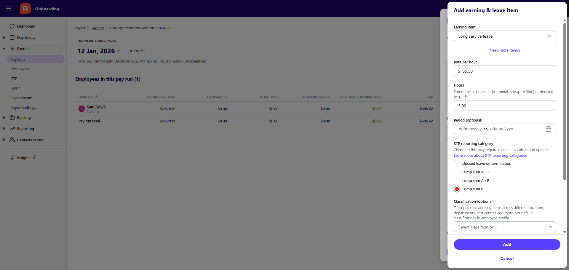 - Select Add. The changes will be reflected in the pay run drawer and display the relevant reporting category.