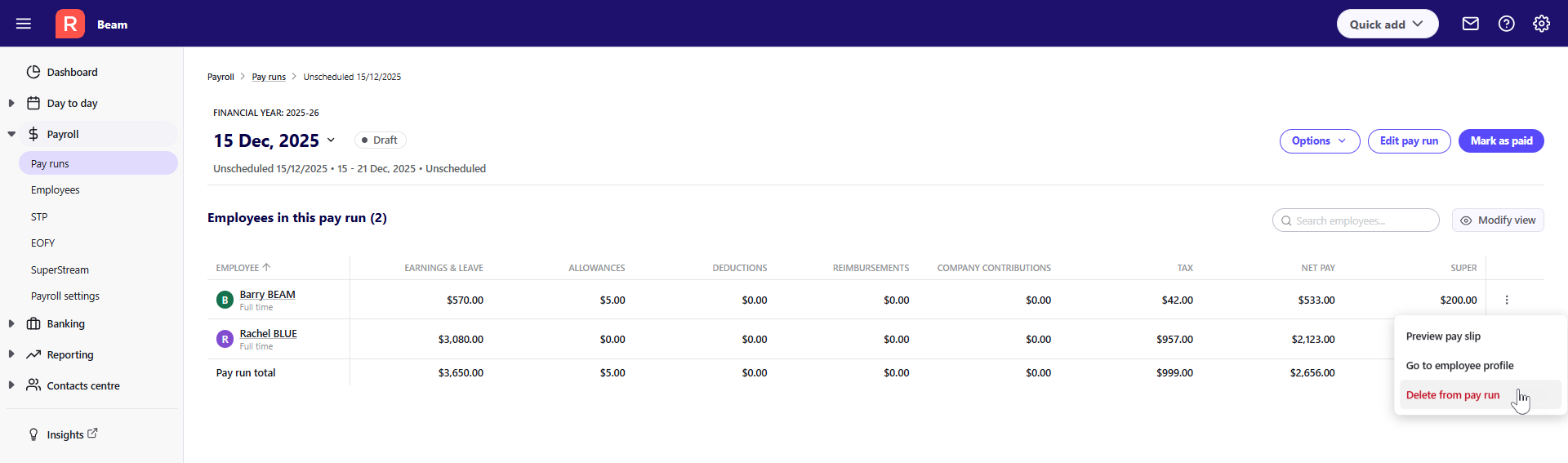 You can either remove an employee from the pay run, or from the screen where you're editing the employee's pay. To remove from the pay run, click on the 3 dots next to the employee's name, then select Delete from pay run.